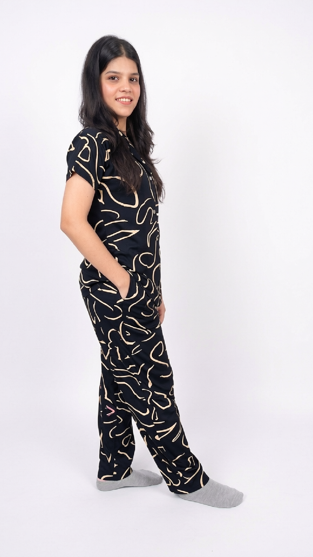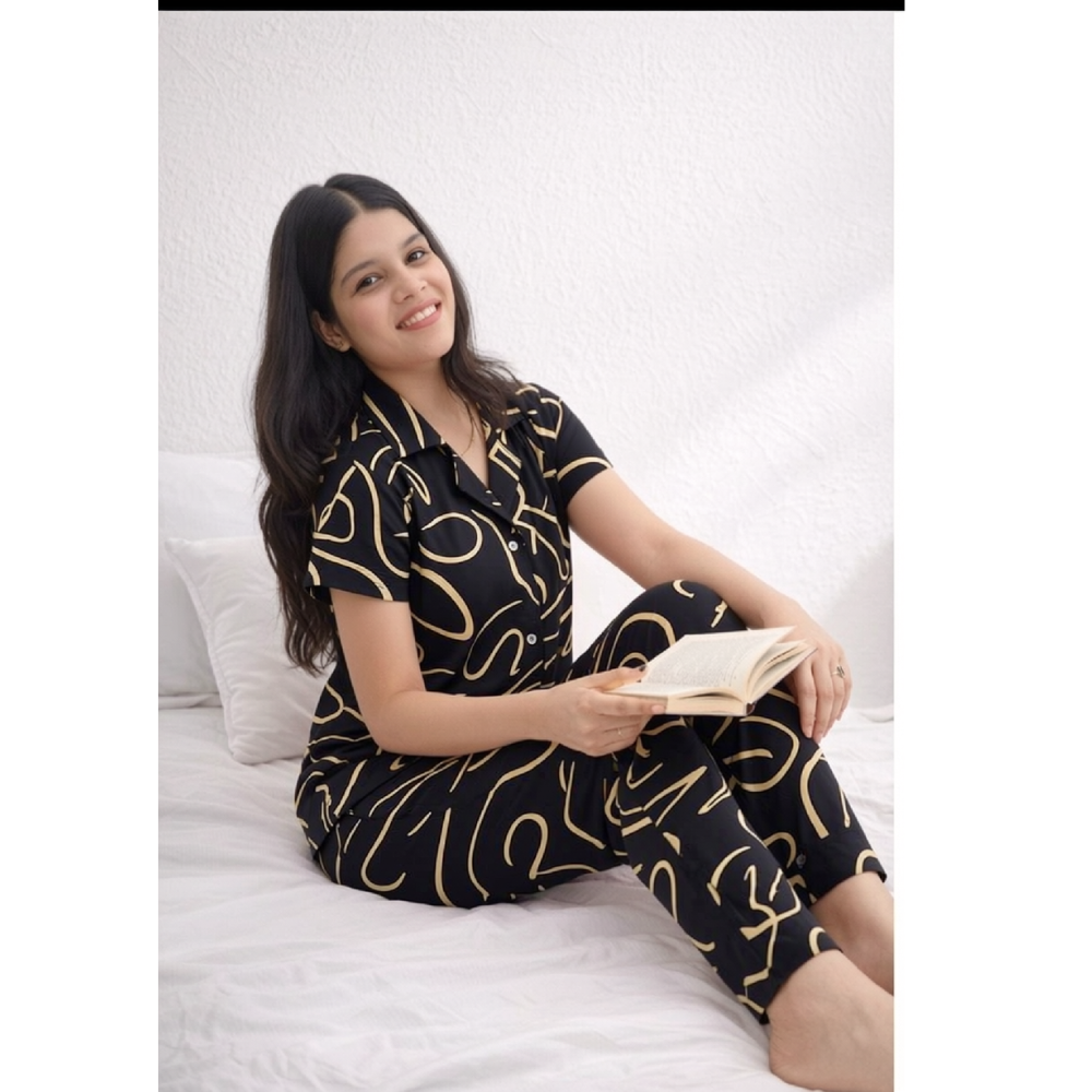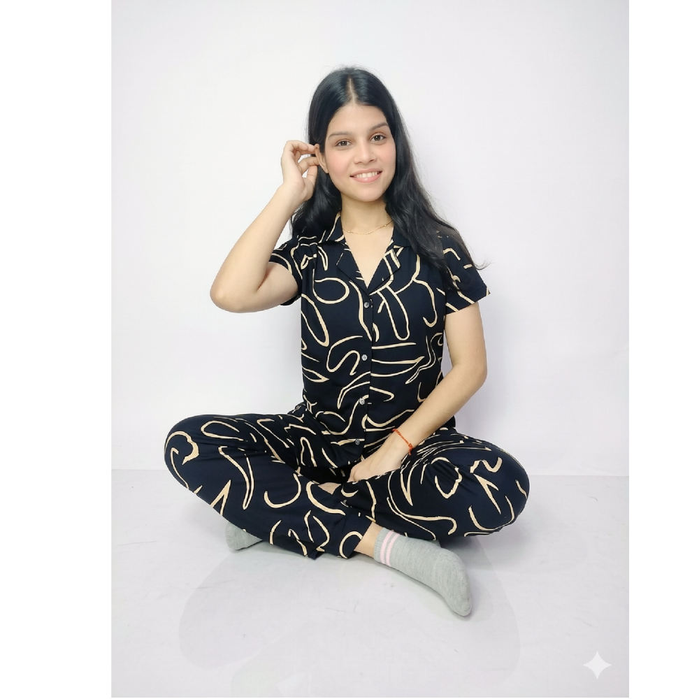 Upgrade your nightwear collection with this elegant and ultra-comfortable night suit from DimoWear. Designed for modern women who love comfort with style, this black co-ord night set features a classy gold abstract print that gives a premium and sophisticated look.